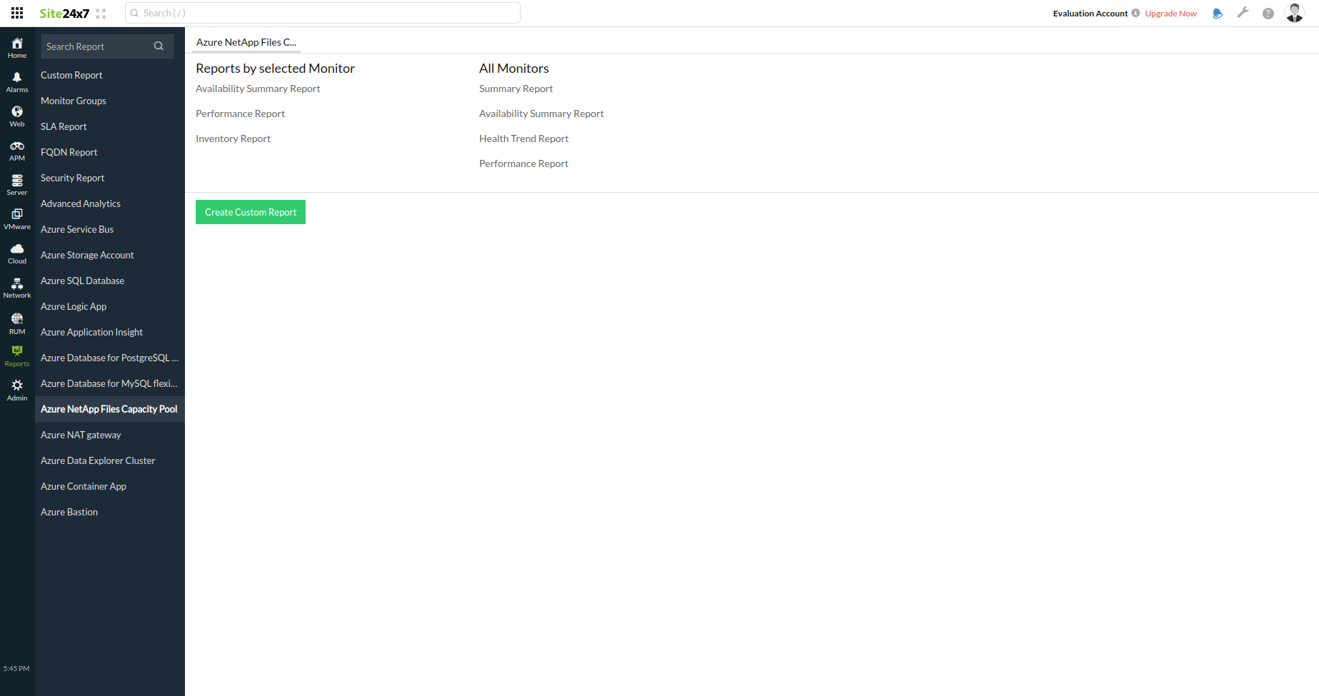 You can find the Availability Summary Report, Performance Report, and Inventory Report for one selected monitor. Or you can get the Summary Report, Availability Summary Report, Health Trend Report, and Performance Report for all the Azure NetApp Files capacity pool monitors.