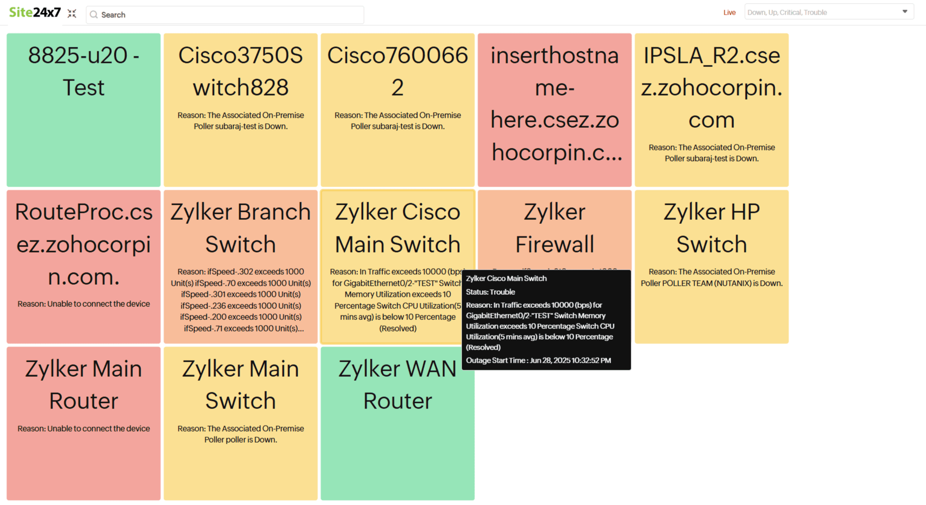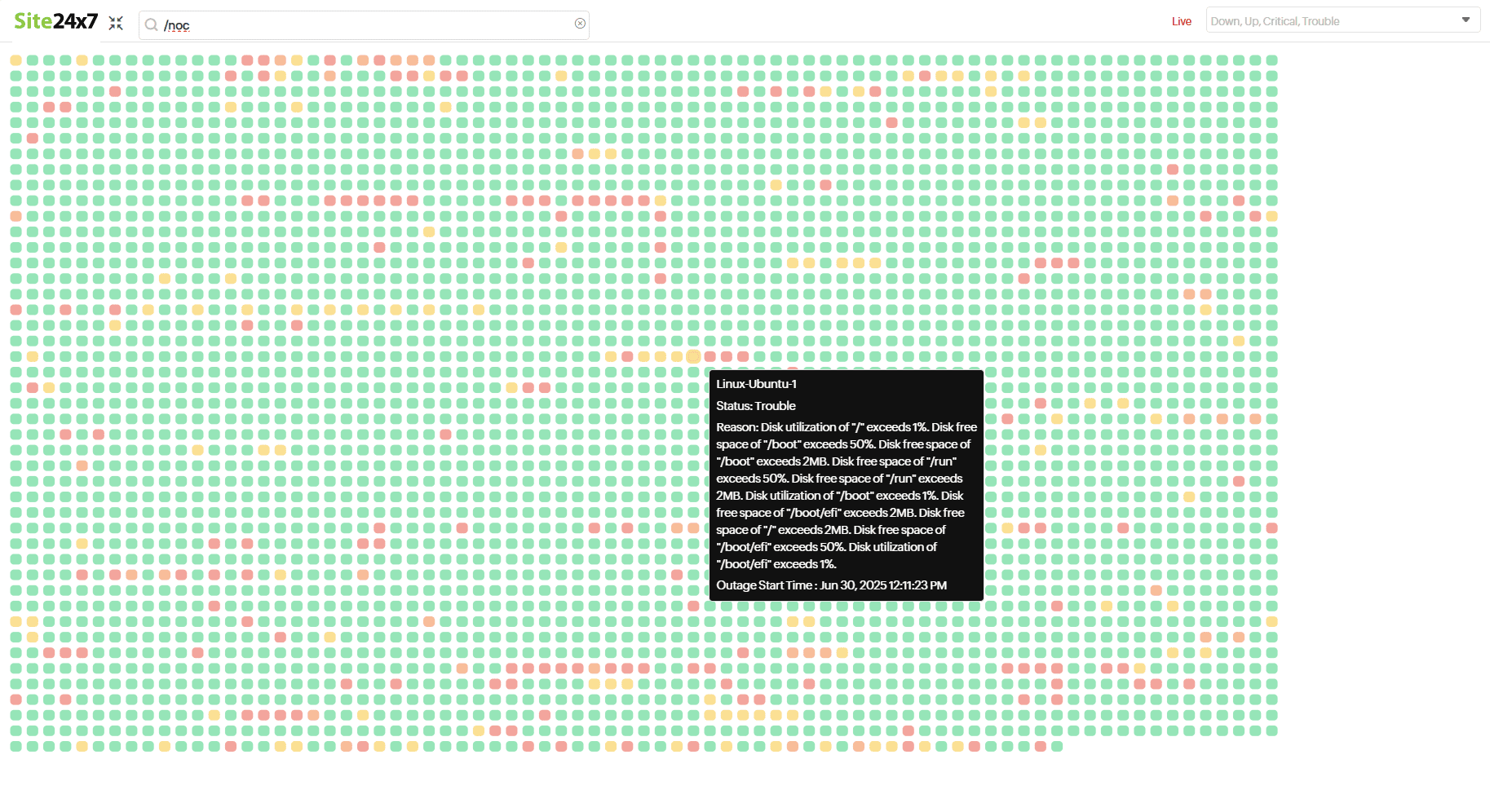Track the availability of all configured resources in Site24x7 at a glance with the NOC view. The color-coded tile layout provides instant insights into each resource's name, real-time status, reason for the outage, and the duration it has been in a Down, Trouble, or Critical state when you hover over the tiles. Click on any tile to drill down and explore the details of the respective resource. You can visualize up to 10,000 monitors in the NOC view.