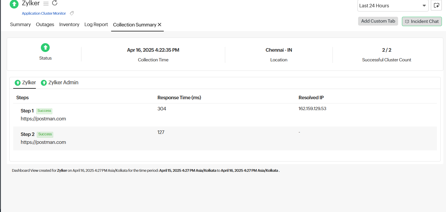 Each step within a monitor includes the response time, resolved IP (if applicable), and success status. This view helps you quickly assess step-wise performance and identify any issues at specific stages in the monitoring sequence.
