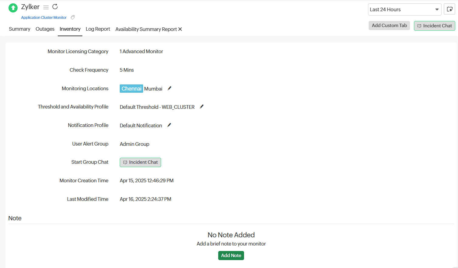 This section captures the basic monitor information and its various configuration settings, including licensing type, monitoring locations, thresholds, and more. You can also add a note and start an incident chat by clicking the Incident Chat button.