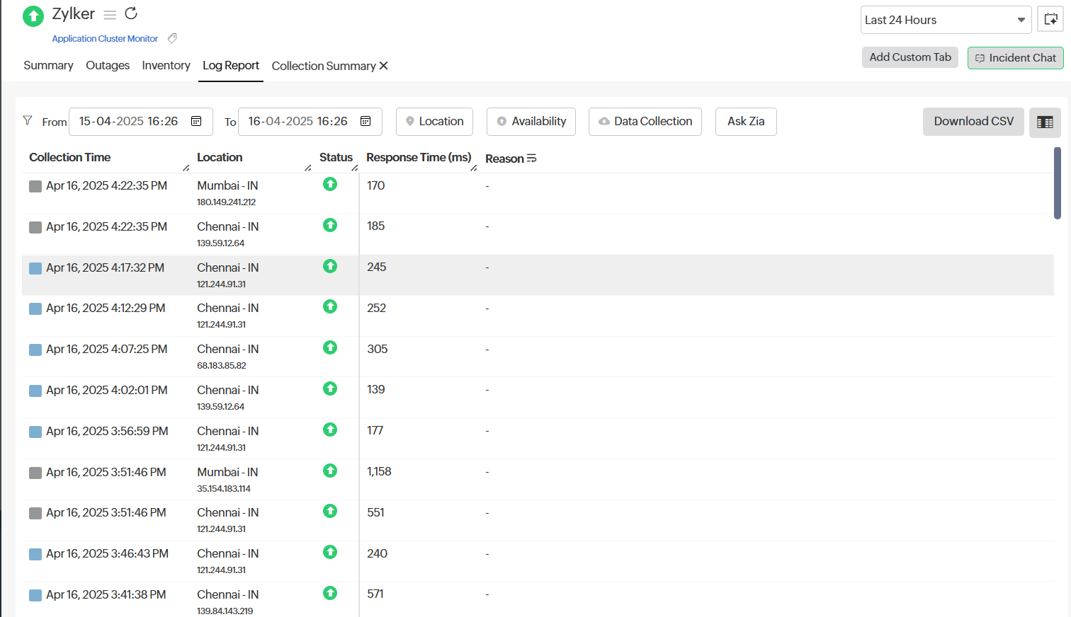 With our integrated log records for individual monitors, you can get in-depth knowledge about the various log details for the configured monitor over a custom period. You can also filter the log based on location and availability. Various data including availability status, HTTP status codes, DNS response times, etc. are captured here. You can also export the log report in CSV format.