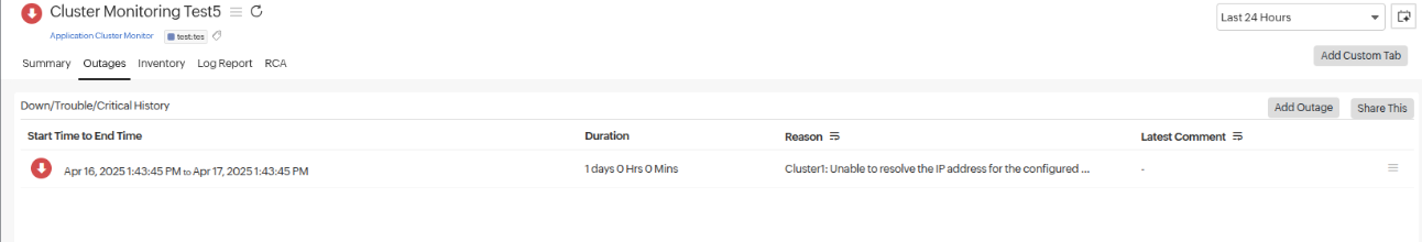 You can access the Outages tab in your monitor's details page to gather detailed insights on the various outage and maintenance downtime. It provides you with sufficient information to troubleshoot issues.