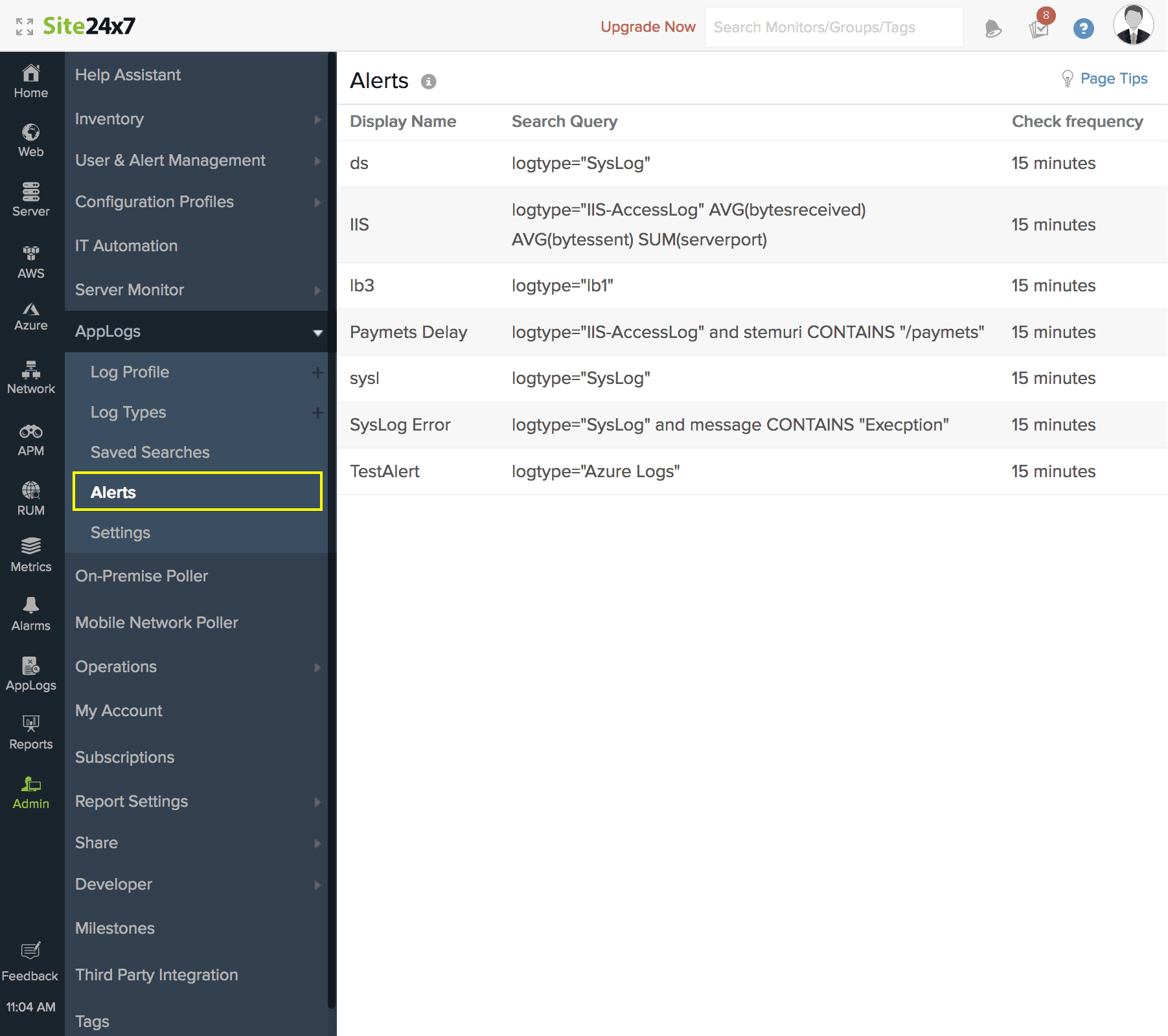 - Go to Admin > AppLogs > Alerts. This page lists all your configured alerts.