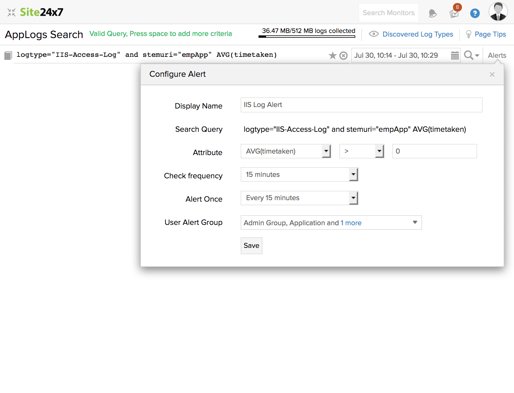 Site24x7's AppLogs Alerts allow you to set thresholds and send notifications to your predefined user alert groups so you can thwart critical operational issues right when they start.