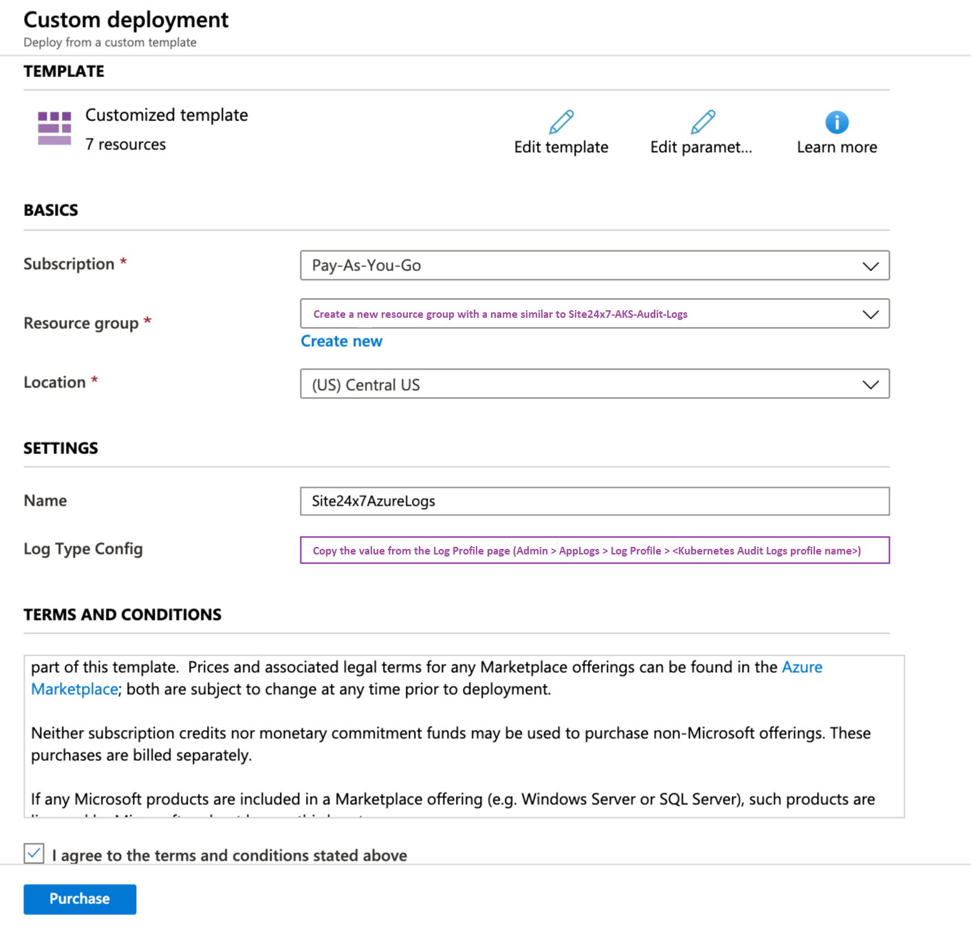 Follow the instructions in the Azure diagnostic logs document to configure the Azure resource using an ARM template. When entering the details on the custom deployment blade (steps 7 and 8) in the above document, make sure you edit the following specific to the Kubernetes Audit Logs: