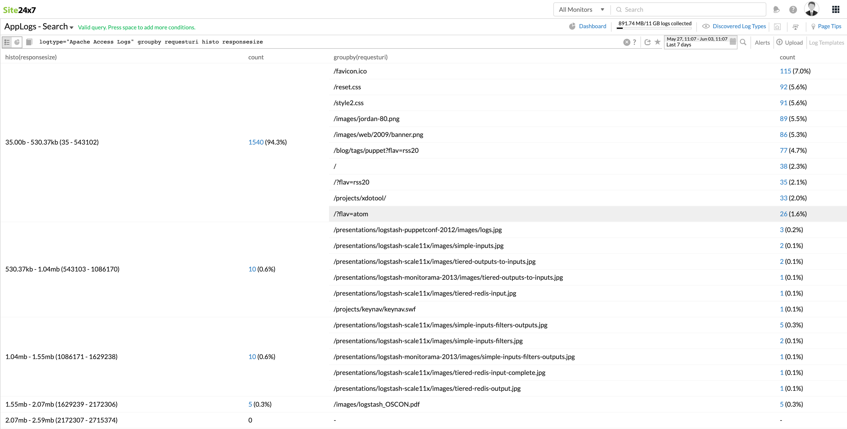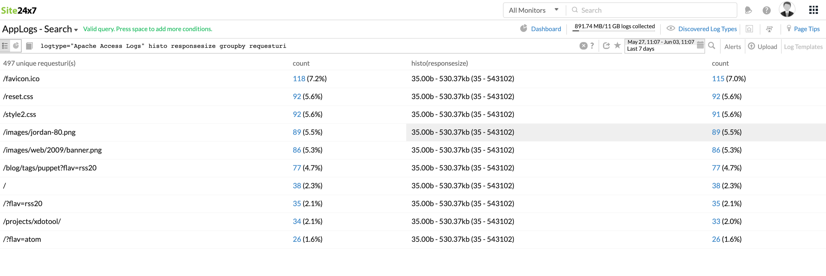 logtype="Apache Access Logs" groupby requesturi histo responsesize