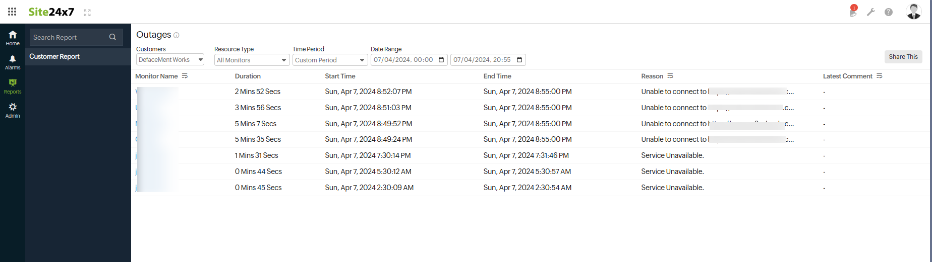 The outages report helps you view all the outages related to your resources over a specific period of time on a single dashboard. Outages are captured and made visible right on the home screen to keep you updated about any critical issues. Now, you can view reports on outages for the customers in your account in one place.