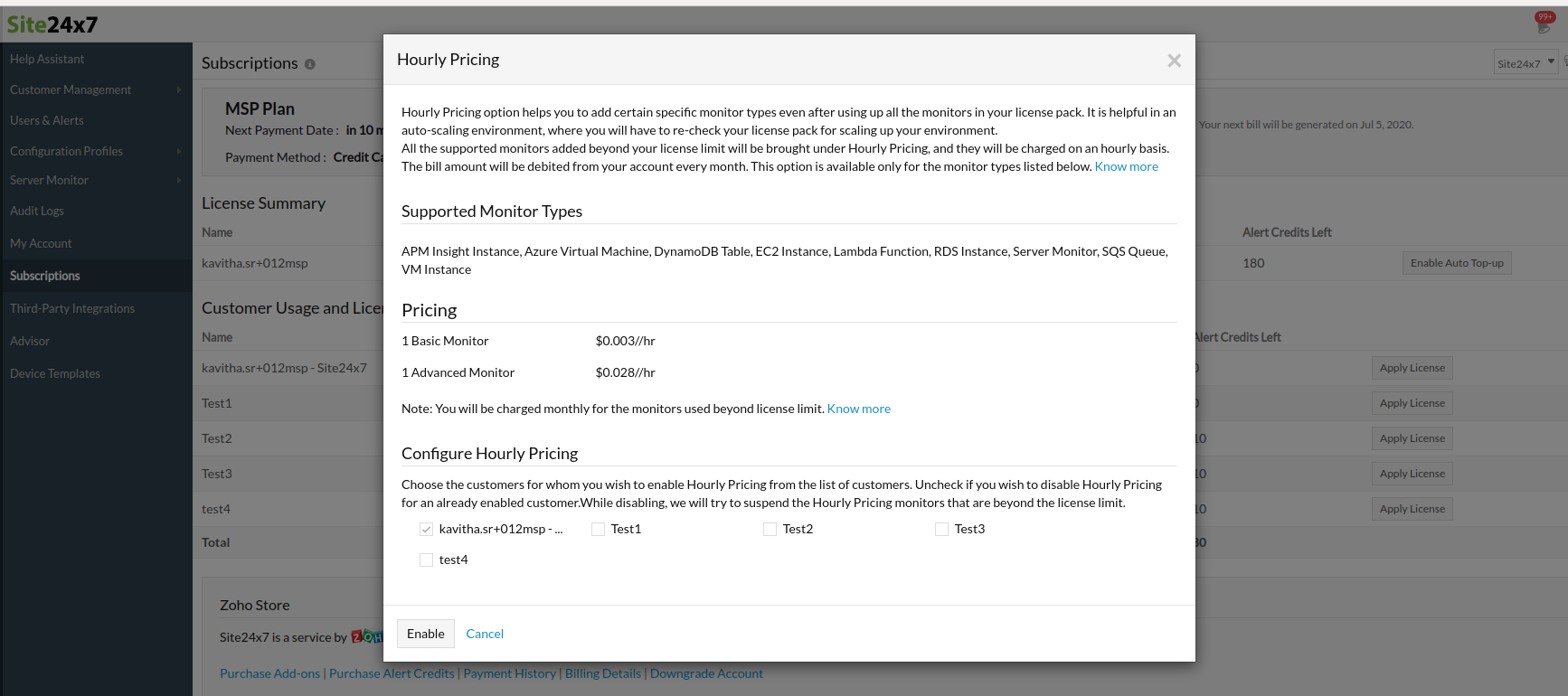 3. Click on the Configure Hourly Billing option provided next to the Hourly Pricing option and then click on the Enable button in the Hourly Billing pop-up that opens. Hourly Billing for selected MSP customers will be enabled.