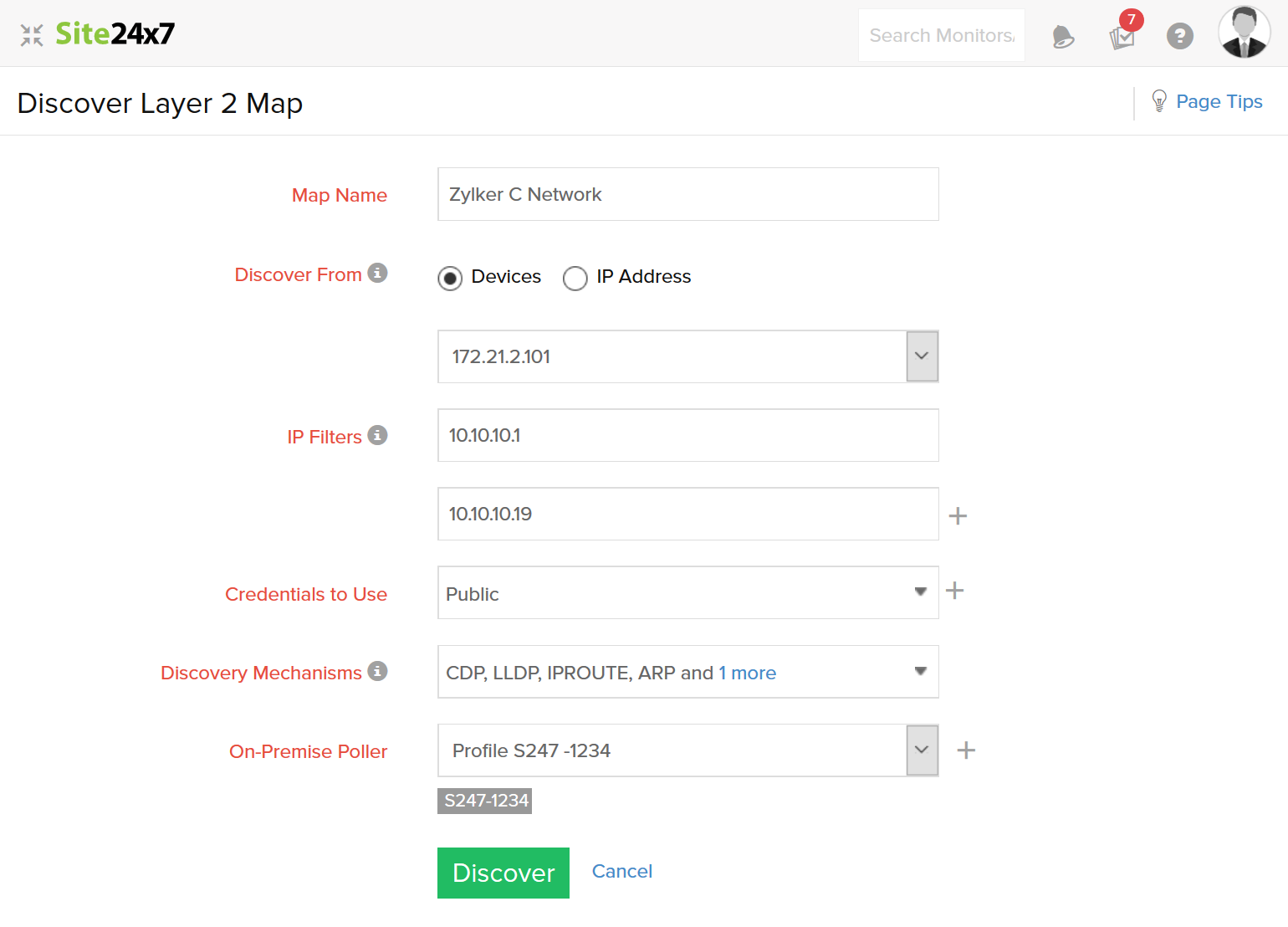 - Discover From: Select Devices if you wish to discover and create a network map using a network device that is already being monitored, and select a device from the drop-down menu. If the device is not yet being monitored by Site24x7, select IP Address and, in the box that appears below, enter the IP address of the device you wish to discover and map.