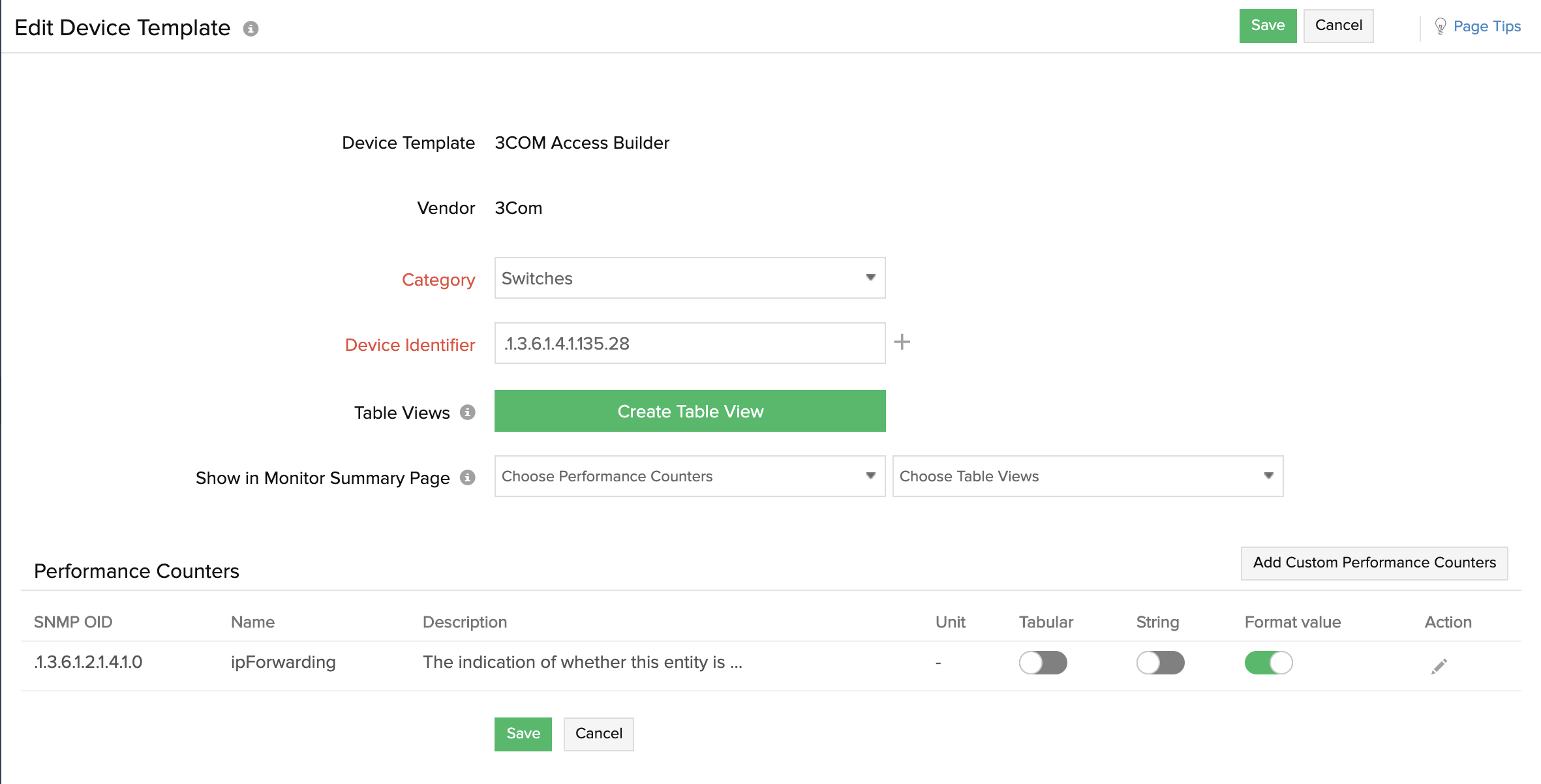 • If you want to monitor exhaustive values of an attribute like the temperature of a Cisco device (including the temperatures of left and right inlets, outlets, fan, and more), we offer support for tabular performance counters, which monitor your tabular object identifiers (OIDs).