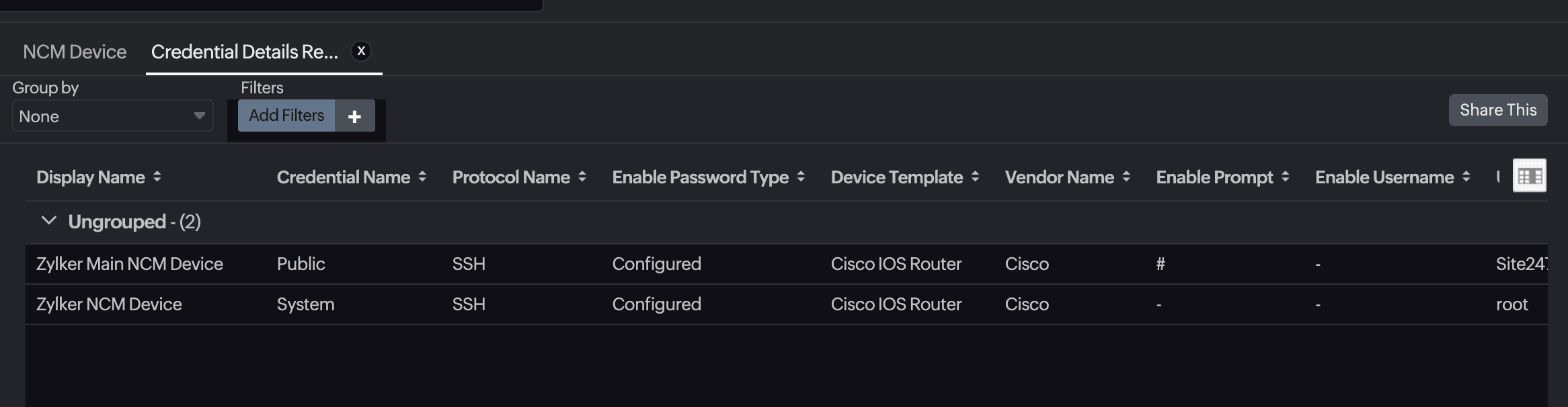 The Credential Details Report in Site24x7's Network Configuration Manager (NCM) offers an in-depth view of the authentication credentials, protocol configurations, and device-specific parameters associated with your network infrastructure. This report helps troubleshoot credential mismatches.