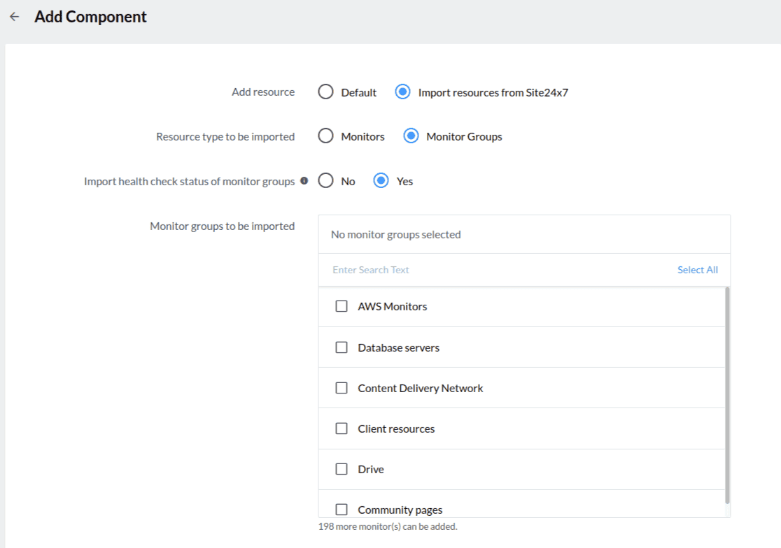 - Navigate to Add Component > Import resources from Site24x7 > Monitor Groups.