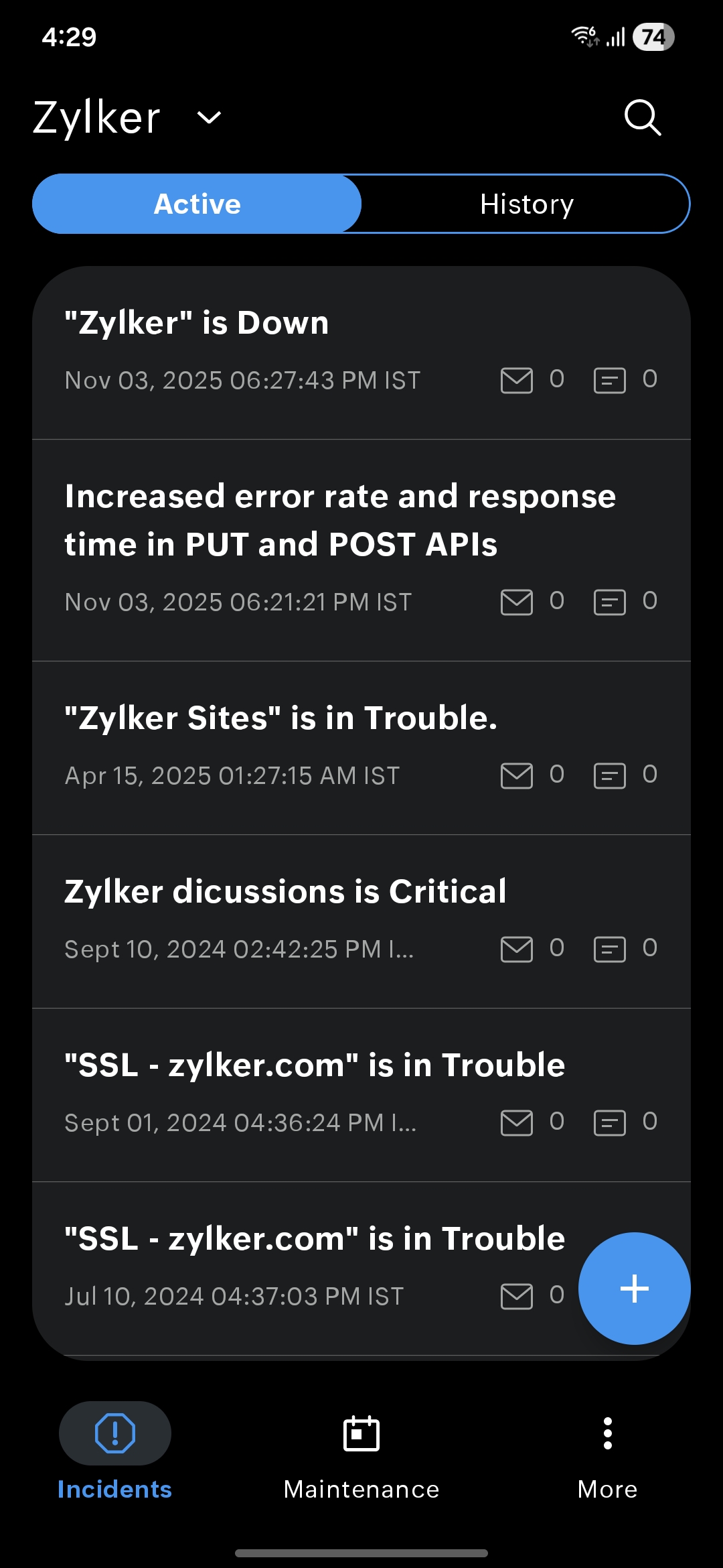 Incidents that are currently inactive or resolved are listed under the History section. Upon selecting an incident, the following details are displayed: